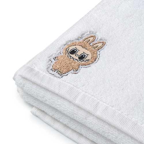 - Labubu logolu yumuşak dokulu pamuk bornoz ve saç havlusu.
